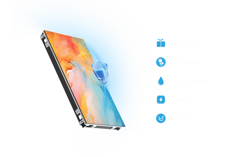 前面と背面にIP65の高保護。前面にはMIP+GOBカバーがあり、耐水性、湿気防止、静電気防止、衝撃防止機能があります。